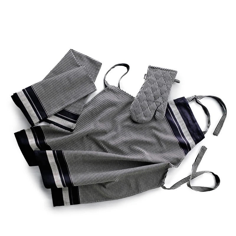 I dette flotte tekstilsæt får du 1 stk. forklæde, 1 stk. grillhandske og 2 stk. viskestykker. Du får altså alt, hvad man har brug for i et køkken, når det kommer til tekstiler. Det hele er produceret i 100% ren ny bomuld i flot og stilrent design, som kan bo i de fleste køkkener. Tekstilerne må maks. blive vasket ved 40 grader, og hver opmærksom på, at der kan forekomme overskudsfarve, derfor anbefales det, at tekstilerne de første gange ikke vaskes med andet tøj. Brug vaskemiddel uden optisk hvidt og blegemiddel. Sættet er perfekt som værts eller indflyttergave.