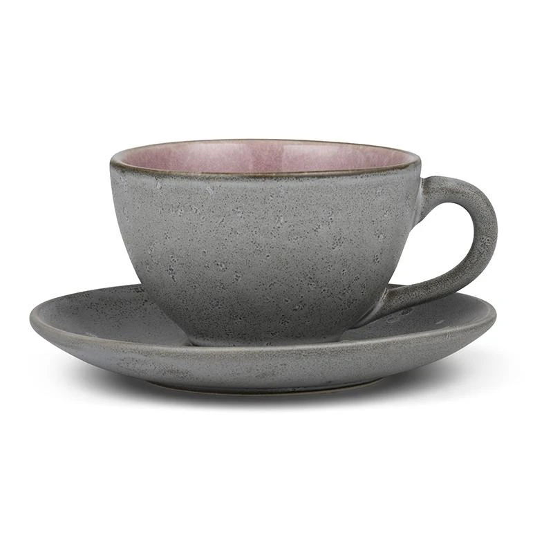 Fremstillet i matgrå stentøj med blank lyserød glasur på koppens inderside.