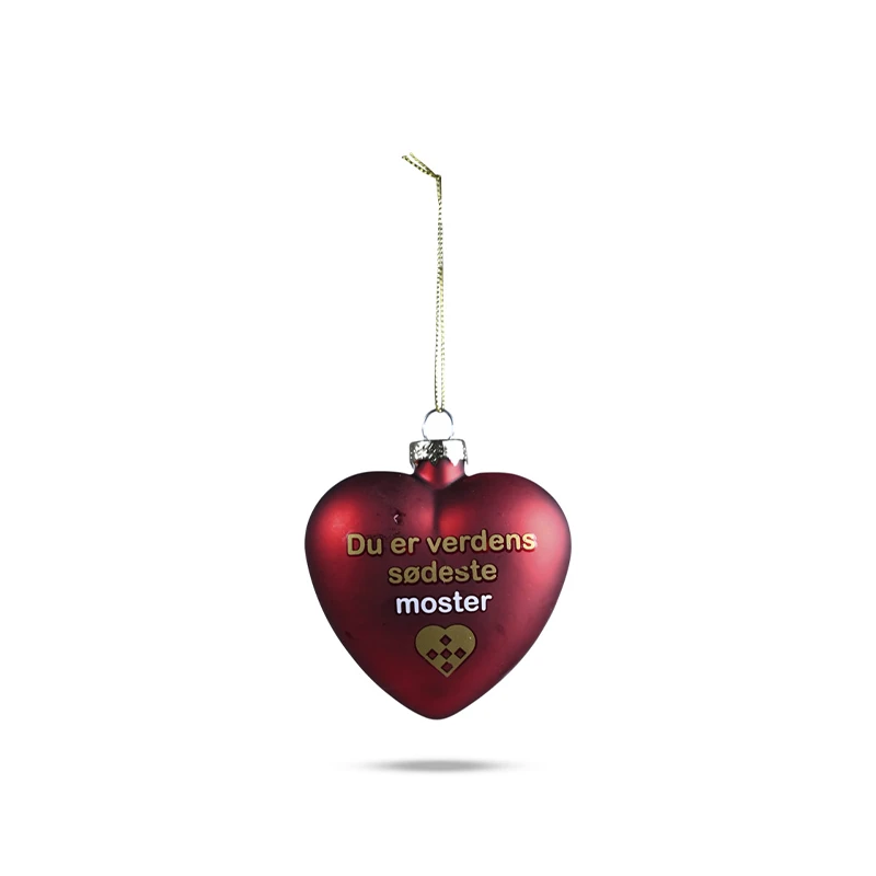 Charmende julekugle formet som hjerte fra Det Gamle Apotek. Fremstillet i glas, graveret med søde ord.
