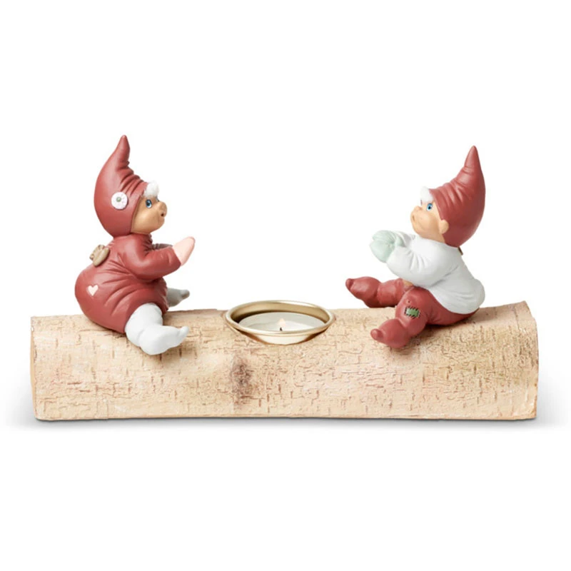 To søde nissebørn sidder og varmer sig trygt og godt ved den varme ild.