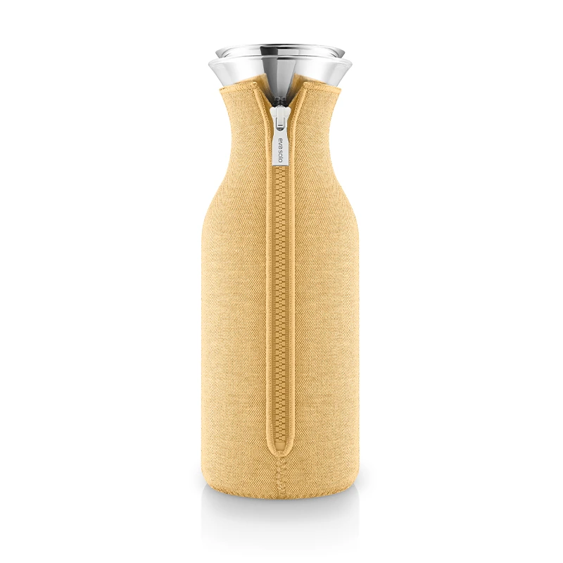 Den fine køleskabskaraffel fra Eva Solo er unik i sit udtryk og er 100% drypfri. Den passer i de fleste køleskabslåger, og er enormt velegnet til kolde såvel som varme drikke. Sæt den fine kande på bordet under middage med gæster eller til aftensmaden i hverdagen – den kan bruges til det hele. Den fine lynlåslomme er med til at holde på varmen eller kulden og sørger for, at man hverken fryser fingrene eller brænder sig. Alle dele til karaflen tåler maskinopvask. Dragten kan vaskes på skåneprogram ved 30 grader, men vi anbefaler håndvask.
