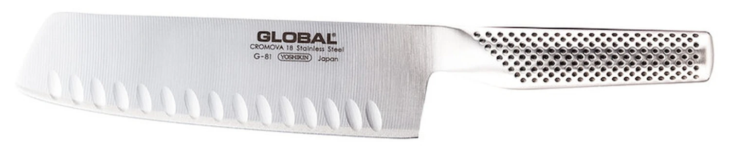 G-81 Grøntsagskniv er skabt med Granton-skær –også kaldet ’luft-skær’. Mønstret er udformet, så råvarerne nemt slipper bladet. Derfor er kniven særligt velegnet til at skære grøntsager i helt tynde skiver, som ellers har tendens til at klæbe. Bladet er samtidig skabt med en let runding, så kniven kan føres i en kontrolleret, vuggende bevægelse uden at løfte den fra skærebrættet. Kniven har et blad på 18 cm.