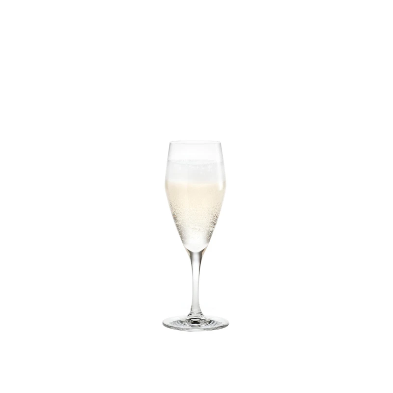 Holmegaard Perfection Champagneglas 23 cl. Champagneglasset har en stor overflade der lader champagnen udvikle dens duft og smagsnuancer. Når champagnen skænkes i glasset så lad de perlende bobler løbe ned langs kanten på glasset.