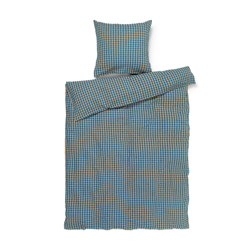 Det nye sengesæt i ternet Bæk&Bølge kommer i farven blå/okker. Blå har en varm og afdæmpet friskhed over sig, mens okker giver en dybde og ro, der minder om en gåtur ved skov og strand på en smuk efterårsdag. Materialet er 100% økologisk bomuld, der både er OEKO-TEX®-mærket og GOTS-certificeret – og så er det ovenikøbet strygefrit. Pudebetrækket lukkes med kuvertlukning, mens dynebetrækket lukkes med knaplukning. Har du flere forskellige sengesæt fra JUNA, kan du mikse og matche de forskellige farver og mønstre på kryds og tværs og skabe din helt egen stil i soveværelset.