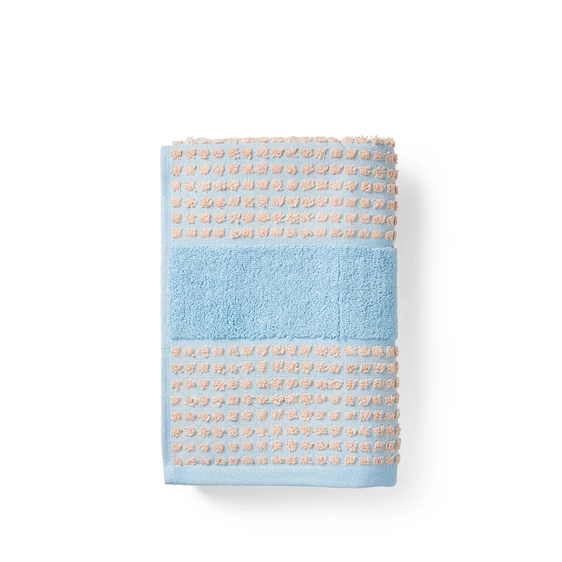 Det smørbløde Check-håndklæde fra Juna er lidt hverdagsluksus i 100% økologisk bomuld, der både er OEKO-TEX-mærket samt GOTS-certificeret. Det bløde håndklæde er ideelt til at have hængende ved siden af vasken på badeværelset, når der skal tørres hænder, og så er det ovenikøbet også ret så flot at have hængende eller liggende foldet sammen. Kan også med fordel bruges som køkkenhåndklæde eller som håndklæde, der svøbes om vådt hår. Farvekombinationen er her lyseblå og sand, og den giver sådan et skønt farvepust til badeværelset. Giv dit badeværelse nyt liv med de nye vaskeklude og håndklæder fra Junas Check serie.