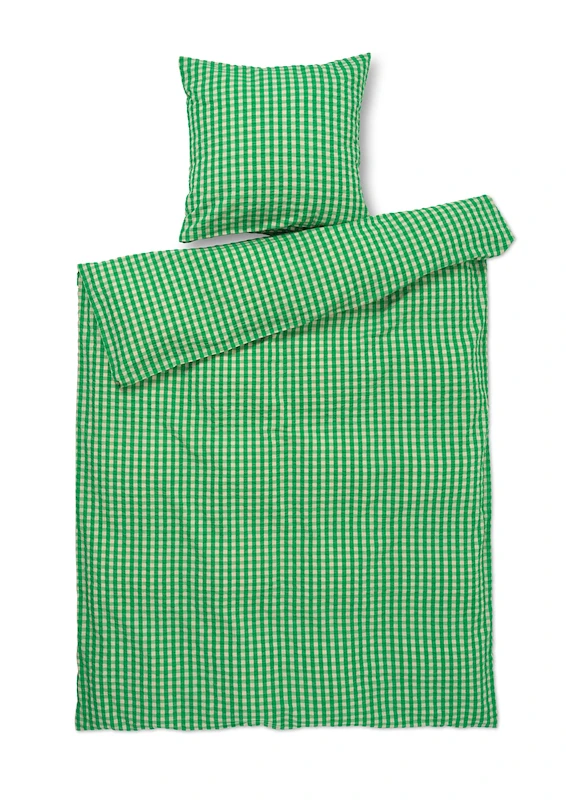 Det sæt tøj du bruger allermest tid i, er dit sengetøj. Derfor er sengetøj fra Juna skabt med intentionen om at være sanseligt, behageligt og 100% økologisk og bæredygtigt, så du trygt kan lægge dig til ro hver aften og få en god nats søvns. Juna handler om glæden ved at omgive sig med tekstiler, der gør livet smukkere, blødere, mere farverigt og sjovere. Derfor er farver og mønstre en stor del af Juna og giver sengetøjet en hyggelig og uhøjtidelig følelse. Den velkendte og klassiske ternede vævning fortolkes i en moderne farvepalet og det er netop kombinationen af det nostalgiske og nyskabende er med til at skabe en unik og glad stemning i indretningen. Den ternet Bæk & Bølge i grøn/sand har en skøn friskhed og sprødhed over sig – nærmest som nyudsprungne bøgeblade. Materialet er 100% økologisk bomuld, der både er OEKO-TEX®-mærket og GOTS-certificeret. Pudebetrækket lukkes med kuvertlukning, mens dynebetrækket lukkes med knaplukning. Har du flere forskellige sengesæt fra Juna, kan du mixe og matche de forskellige farver og mønstre på kryds og tværs og skabe din helt egen stil i soveværelset. Bæk & Bølge er vævet, så det har en helt speciel tekstur, der lader luften cirkulere mellem huden og dynen – perfekt til de varme sommernætter. Det giver en god nats søvn, så du kan restituere og lade op til en ny dag. Og så er det ovenikøbet strygefrit, så du kan lade den lune sommervind om tørringen og lægge sengetøjet på direkte fra tørresnoren. Sengesættet består af 1 dynebetræk på 140×220 cm og 1 pudebetræk på 60×63 cm