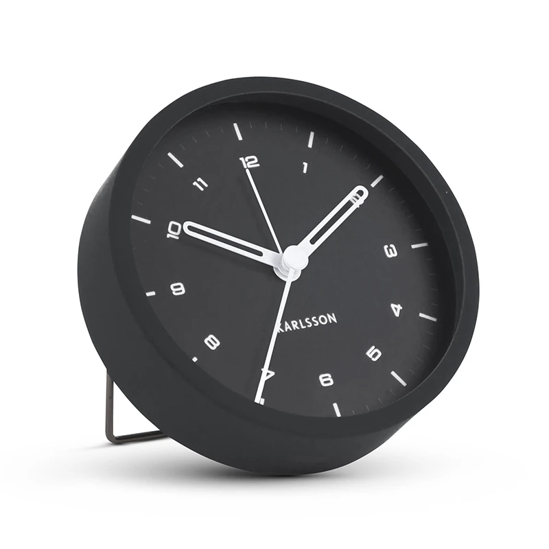 Flot vækkeur der anvendes i soveværelset men også kan stå fint i stuen på kontoret som et analogt ur. Sort stål med sort skive.