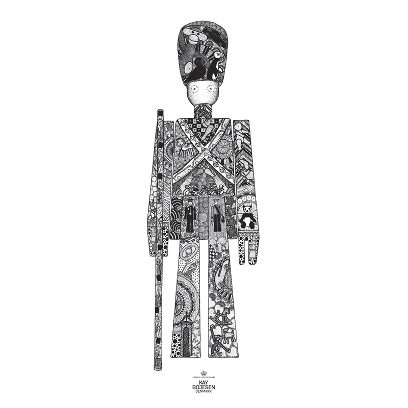 Kay Bojesen Galleri Garder plakat sort/hvid 50×70 cm. Skøn og dekorativ plakat der viser den verdenskendte garder. Detaljen findes i de mange skjulte figurer der er brugt for at tegnegarderen, hvilket giver noget at se på for både små og store i timevis. Håndtegnet af Vicky Gro Hjortsøe.