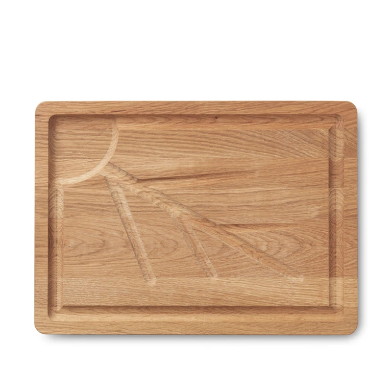 I serien kommer nu et solidt og funktionelt skærebræt i FSC-certificeret egetræ – perfekt til køkkenet, når der skal skæres, hakkes og snittes. Det er smukt forarbejdet og har runde, bløde former, der gør skærebrættet behageligt at håndtere i det daglige. Desuden er der arbejdet med at give det smukke og naturlige egetræ en finish, der er rar at røre ved, så skærebrættet ikke kun er en æstetisk, men også taktil oplevelse. Kay Bojesens fortællinger i træ begrænser sig ikke kun til hans berømte figurer. Også funktionelle brugsgenstande til hjemmet udgør et helt kapitel i hans mangfoldige designarv. Under navnet Menageri designede Kay Bojesen i 1940’erne en elegant serie, der rummer både skåle, bestiksæt, peberkværne, æggebægre og meget mere – alt sammen udført i træ med det samme minimalistiske, bløde og organiske formsprog, der kendetegner Kay Bojesens øvrige arbejde. Samlere og kendere vil kunne genkende skærebrættet, der er et originalt design fra Kay Bojesens hånd, som nu genintroduceres i egetræ. Den praktiske saft rende sikrer, at overskydende saft samles i hjørnet og ikke flyder ud over køkkenbordet. Saftrenden er samtidig dekorativ og giver skærebrættet sit helt eget udtryk, så det også pynter, hvis det står fremme i køkkenet. Det nye skærebræt er en oplagt gaveidé til eksempelvis bryllupsparret, der skal til at etablere sig – eller den studerende, som skal flytte hjemmefra. Et godt skærebræt er uundværligt i køkkenet, og en gave man kan have glæde af hele livet.