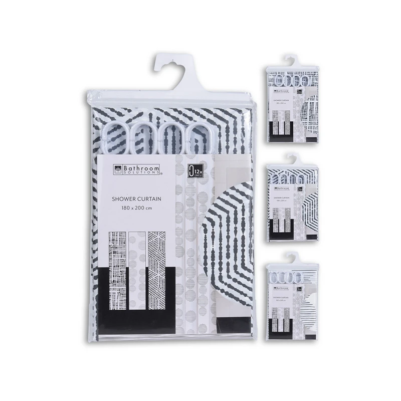 Fremstillet i PEVA – et plastmateriale som er et sundere alternativ til PVC, der ofte bruges til fremstilling af bruseforhæng. Fordelen ved at vælge et badeforhæng i plast, er, at de er transparente, så lyset skinner igennem dem. Har du fx ikke så meget lys lige over din bruser, er et bruseforhæng i plast en god løsning, så du får så meget lys som muligt. Forhænget findes i tre forskellige designs – sort og hvid med forskellige geometriske mønstre. Der medfølger 12 kroge til ophæng, så du nemt og hurtigt kan sætte det op. Vi kan desværre ikke garantere hvilket design, der leveres.