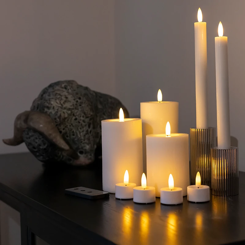 LED lys sæt med 10 dele i flot gaveæske. Lysene har bevægelig flamme som sikre at lysene fremstår livagtige og skaber en dejlig hygge, uden at du skal bekymre dig om sod og os. Sættet består af 3 x bloklys på hhv. 10, 12 og 15 cm. med en diameter på 7,5 cm. Bloklysene bruger 2xAA batterier pr. lys (ikke inkl.) 2 x stagelys med en højde på 22 cm. samt en diameter på 2 cm. Stagelysene bruger 2xAAA pr. lys. (ikke inkl.) 4 x fyrfadslys med en diameter på 3,5 cm. fyrfadslysene kommer inkl. 1xCR2032 knapcellebatteri. 1 x fjernbetjening med tænd/sluk/timer inkl. CR2025 batteri. Timerfunktionen kan indstilles så lysene vil være tændt i 6 timer, og slukket efterfølgende i 18 timer, så slipper du for selv at tænde/slukke dem og du blot kan læne dig tilbage og slappe af.