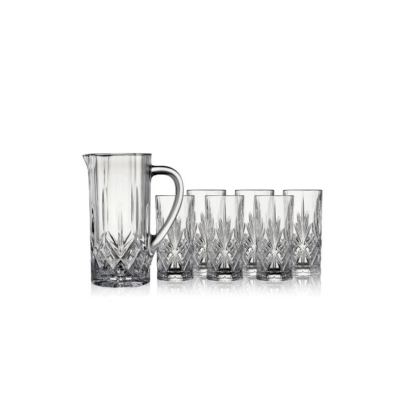 Dette krystalklare Lyngby Glas kandesæt fra Melodia-serien kan løfte alle typer drikkevarer. Fyld kanden med iskoldt vand, saft eller iste på en varm sommerdag – eller brug den til drinks, en frugtfyldt Sangria eller Gin Hass. I sættet har du nok til at slukke 6 tørstige munde. Udover den smukke 1,2 liters kande på 22,5 cm, får du nemlig 6 stk. high ball glas med en kapacitet på 36 cl og en højde på 15 cm. Lyngby glas fremstilles i blyfrit krystalglas. Glasset gennemgår en patenteret proces, hvor det får en større holdbarhed og mere klarhed. Det gør også glassene velegnede til opvaskemaskine. Ved vask i opvaskemaskine bør glasset dog vaskes med et glasprogram eller på lavere temperaturer.