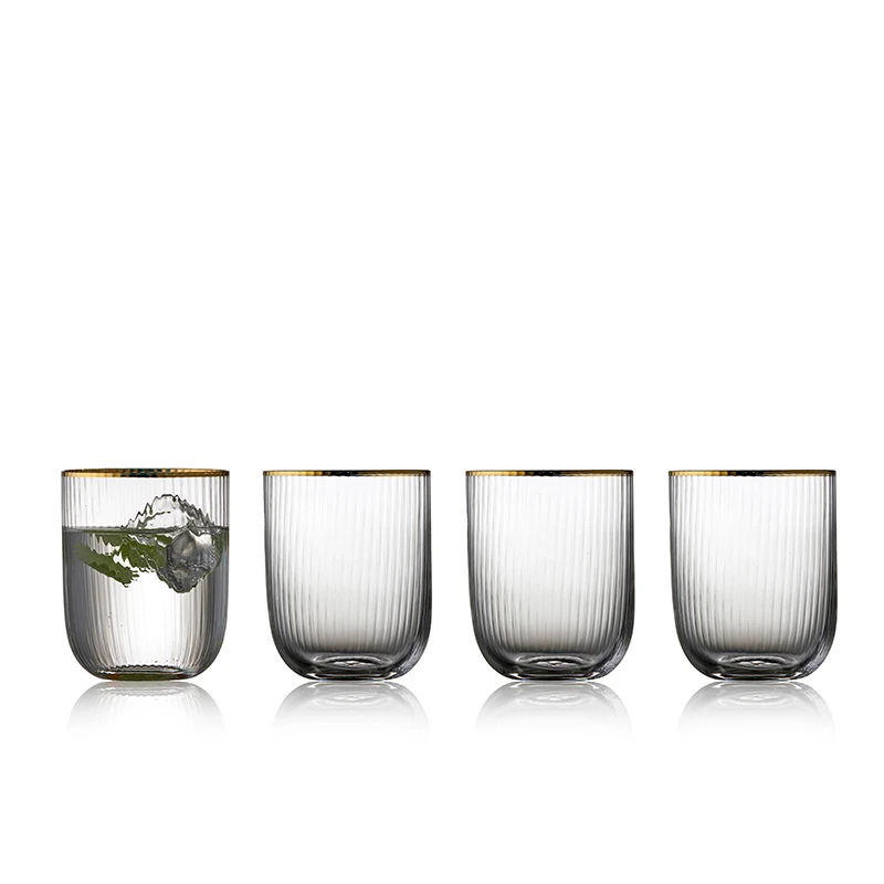 Smukke tumblerglas i bløde, runde former. Glassene har et elegant riflet design med en guldkant der giver et flot vintagelook.