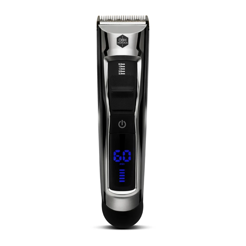 OBH Nordica hårklipper med kraftig motoreffekt og klippefunktion. Ekstra skarpe blade i rustfrit stål med titanium belægning der gør at kniven holder sig skarpe. Kan anvendes både med og uden ledning. 35 længdeindstillinger fra 0,5-30 mm. Digitalt display der viserer resterende brugstid på batteri, status for batteriopladning og når batteriet er fuldt opladet. Genopladeligt li-ion batteri der giver op til 60 minutters effektivt ledningsfrit brug.