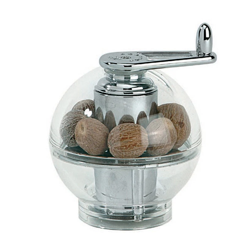 Plads til 7-8 muskatnødder. Meddobbelt rustfrit stål rivejern -hvilketbetyder, at nødderne rives meget fint