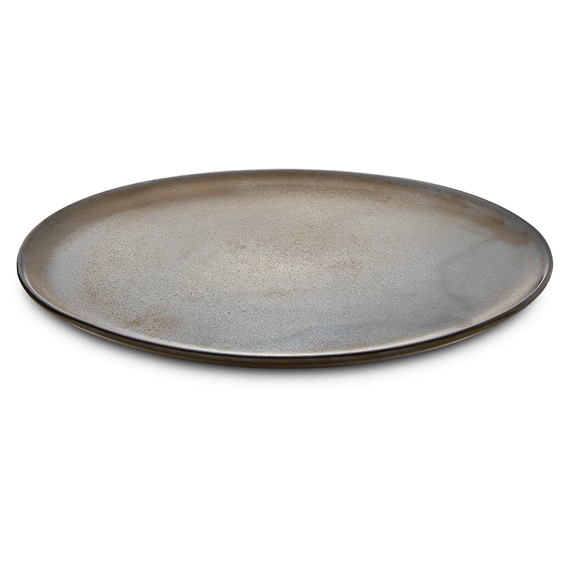 Aida RAW flad tallerken 28 cm. Aida RAW metallic brown leder tankerne hen mod en vidunderlig sensommeraften ved søen med de dybe, rå farver har etskønt nuancerende farvespil i den reaktive glasur. Aida RAW stellet tåler ovn, mikroovn og opvaskemaskine. RAW er håndlavet stentøj med ridsefri glasur. Brun metallic Spisetallerken/ middagstallerken 28 cm