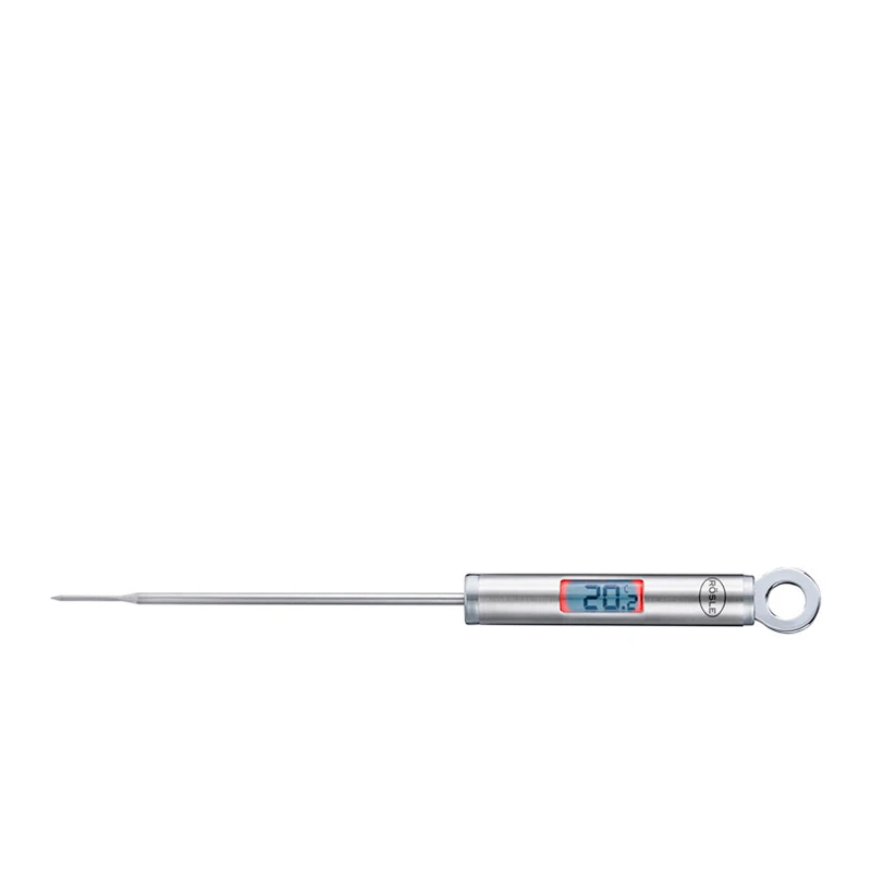 Med et Rösle gourmettermometer opnår du perfekte resultater i køkkenet. Termometeret har et digitalt display, der måler -40°C til +200°C, og kan derfor anvendes til alt lige fra temperering af chokolade til stegning af en saftig fredagsbøf. Stegetermometeret kan benyttes til både grill samt ovn, og er fremstillet i rustfrit stål 18/10.