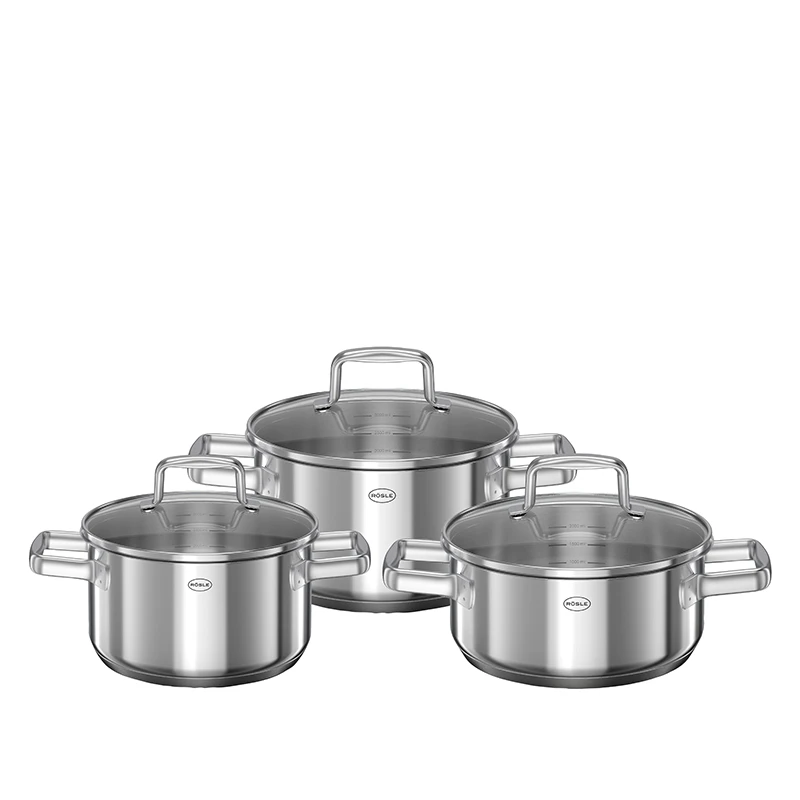 Lækkert Rösle grydesæt i høj kvalitet bestående af 6 dele (3 gryder + 3 låg). Gryderne har en indkapslet aluminiumskerne i bunden, som sikrer hurtig og jævn varmefordeling. På indersiden af hver gryde er der en praktisk måleskala, så det er let som ingenting af afmåle vand eller ingredienser direkte i gryderne. Gryderne kan bruges på alle varmekilder inkl. induktion.