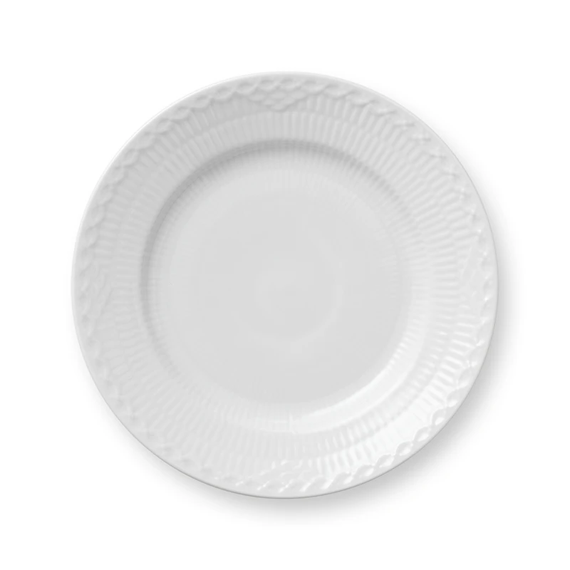 Royal Copenhagen hvid halvblondeflad tallerken19 cm. I hvid halvblonde har det riflede stel fået tilføjet en ekstra, elegant, detalje med halvblonden langs kanten af stellet. Stellet har et smukt romantisk men samtidigt moderne udtryk.