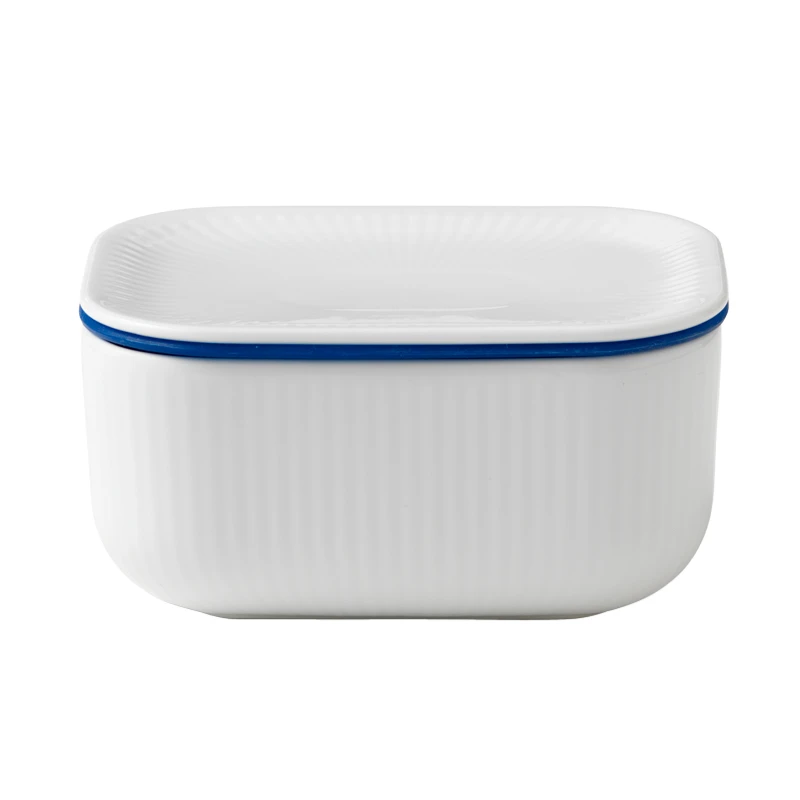 Royal Copenhagen Hvid Riflet smørkrukke med tætsluttende låg. Inkl. silikoneringe i blå og grå