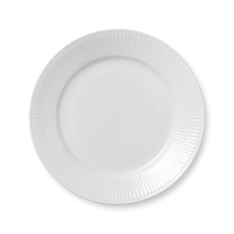 Royal Copenhagen Hvid Riflet Tallerken 22 cm. Et stel der er nutidigt og alligevel klassisk. Et moderne stel der passer til ethvert bord – hverdag eller fest. Kan mixes med andre stel men er også elegant på egen hånd