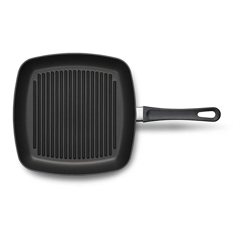 Grillpanden har høje spide grillribber der er med til at give maden sprøde, velsmagende og dekorative grillstriber.