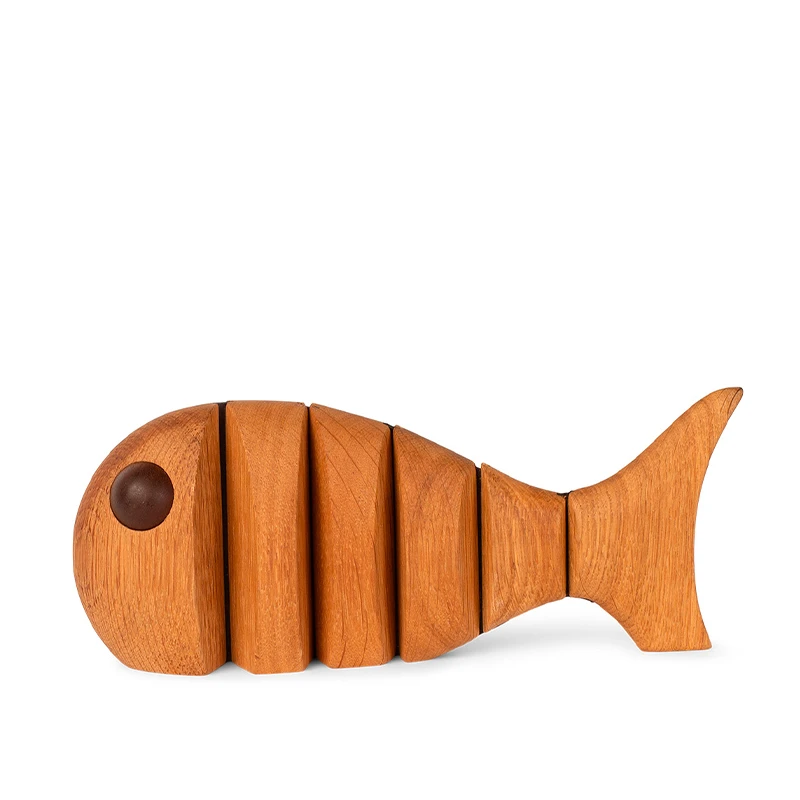Indimellem har vi alle brug for en lille mental pause – et break fra skærme i alle størrelser. Med træfisken fra Spring Copenhagen har du en figur til de her små brain breaks. Fiskens bevægelige led gør den sjov og anderledes at røre ved, så du kan sidde og vugge halen frem og tilbage imens du kobler fra. En sand pausefisk der er afslappende og hyggelig at se på. Fisken er produceret i FSC-mærket eg og bejdset eg.